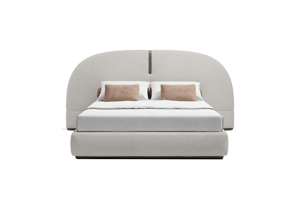Modern bed designed with a gracefully arched headboard and plush upholstery